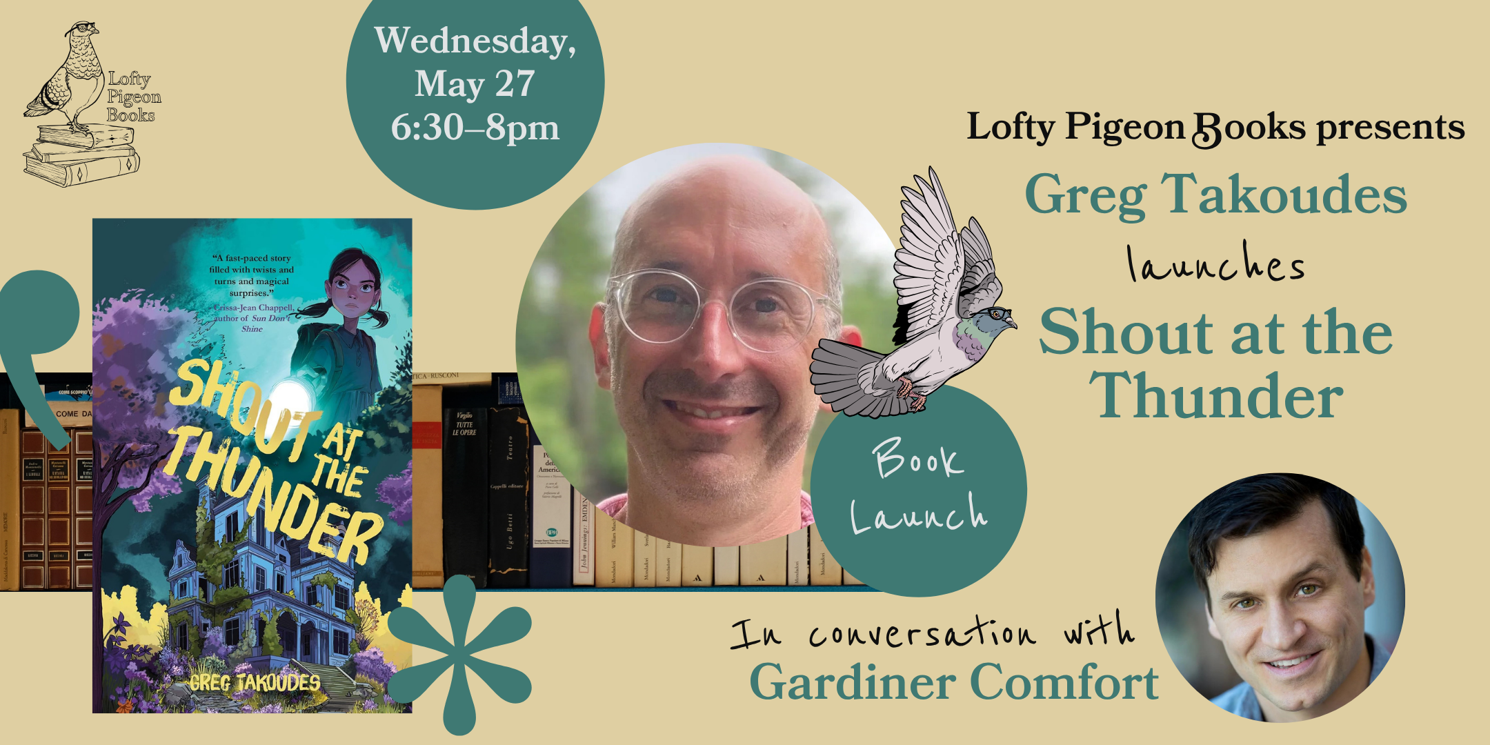 Greg Takoudes launches “Shout at the Thunder,” in conversation with Gardiner Comfort Wednesday, May 27, 2026 6:30 PM 8:00 PM Google Calendar ICS Greg Takoudes launches Shout at the Thunder, in conversation with Gardiner ComfortWednesday, May 276:30–8pm More info