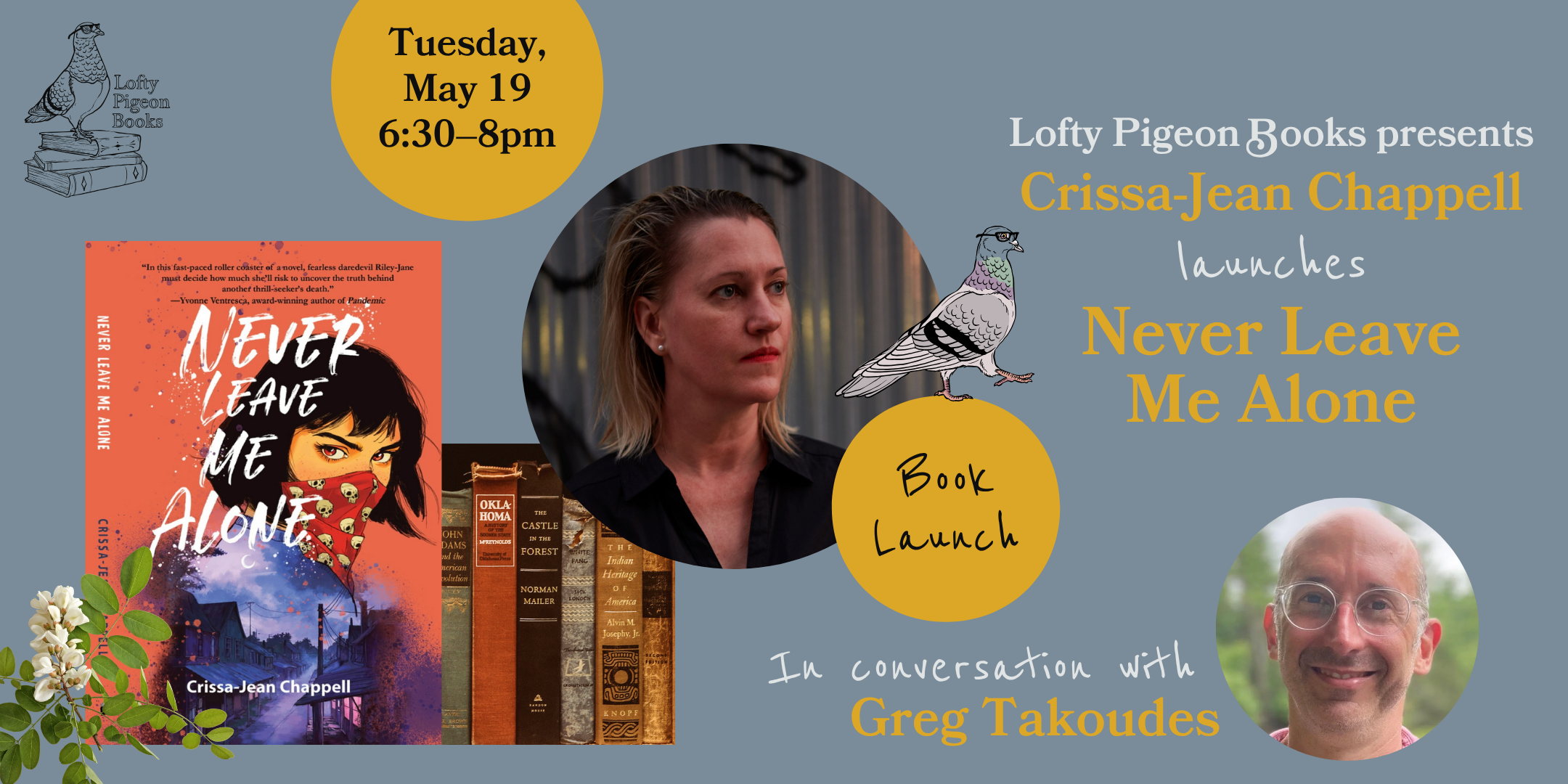 Crissa-Jean Chappell launches “Never Leave Me Alone, in conversation with Greg Takoudes Tuesday, May 19, 2026 6:30 PM 8:00 PM Google Calendar ICS Crissa-Jean Chappell launches Never Leave Me Alone, in conversation with Greg TakoudesTuesday, May 196:30–8pm More info